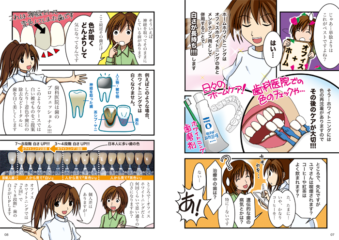 歯を美しくするための歯科的アプローチを漫画で紹介します。ホワイトニング、プチ矯正、セレック治療の三部構成。患者さまへの治療説明資料のひとつとしてご活用いただいております。